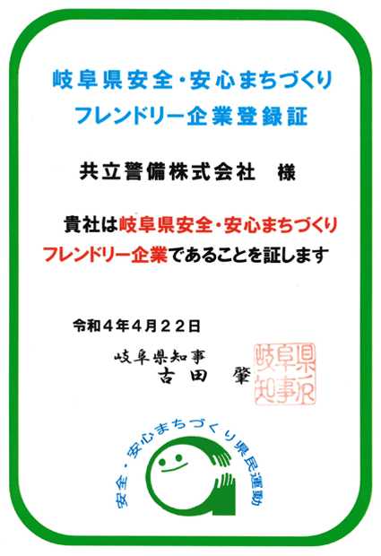 当社も地域で自主的に防犯活動に取り組んでいる企業として「岐阜県安全・安心まちづくりフレンドリー企業」として認定。今後とも、皆さまが安心して暮らせるまちづくりを実現できるよう貢献してまいります。