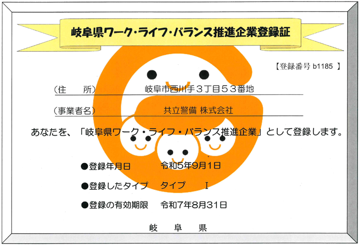 仕事と家庭の両⽴⽀援に取り組む企業として「岐⾩県ワーク・ライフ・バランス推進企業」に登録されました。